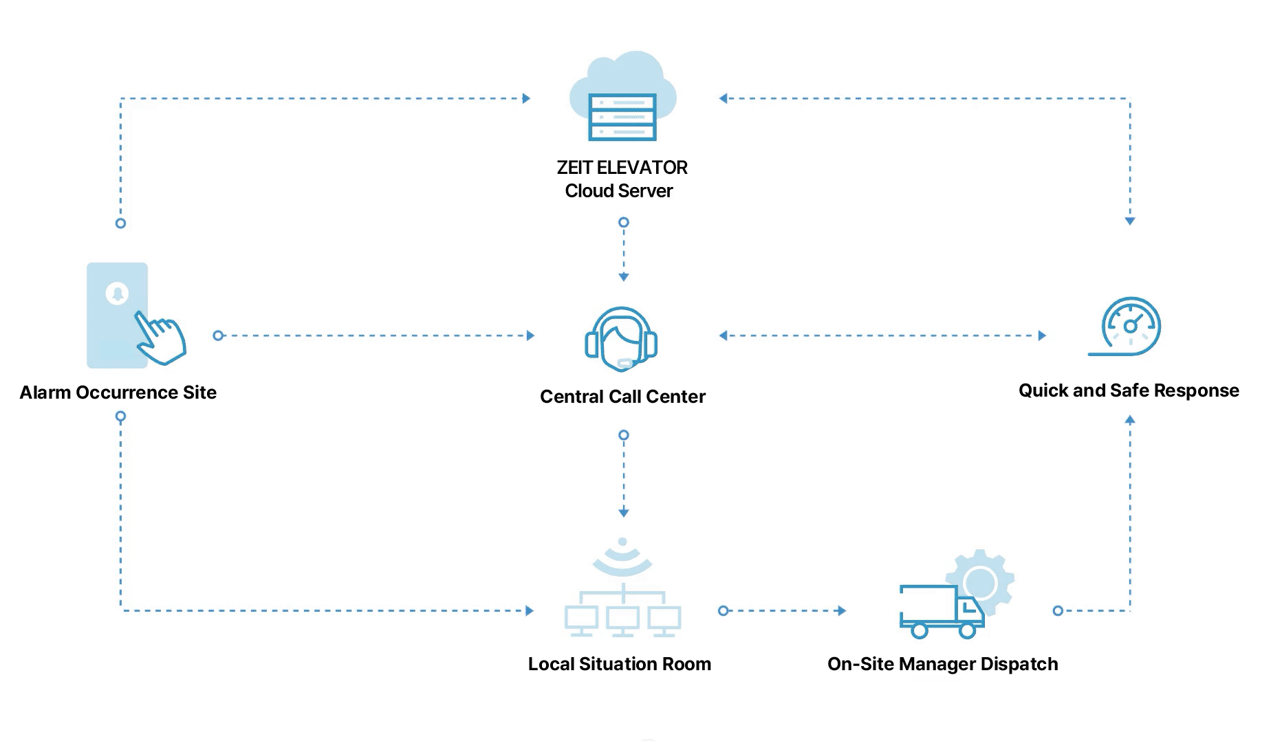 Alarm warning at the scene of an emergency allows quick response. When an alarm sounds, engineers at each site or call center directly contact passengers and dispatch a manager to ensure prompt processing and safe evacuation of passengers.